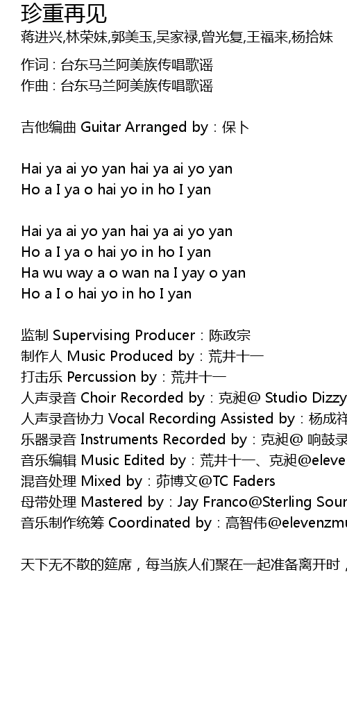 | 作词 : 台东马兰阿美族传唱歌谣 | |