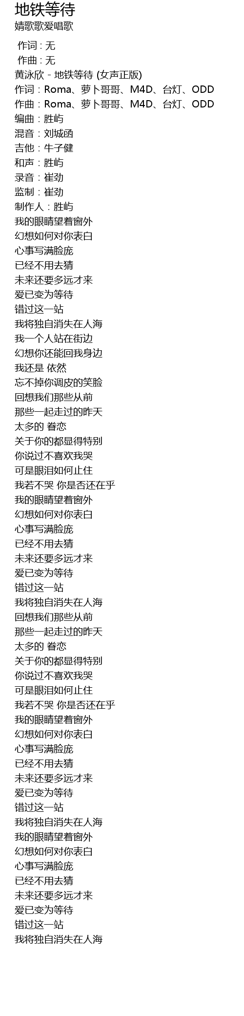 | [00:02.933] | 黄泳欣 - 地铁等待 (女声正版) |