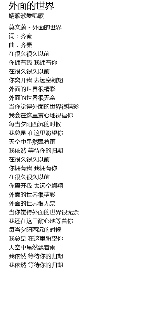 | [00:01.412] | 莫文蔚 - 外面的世界 |