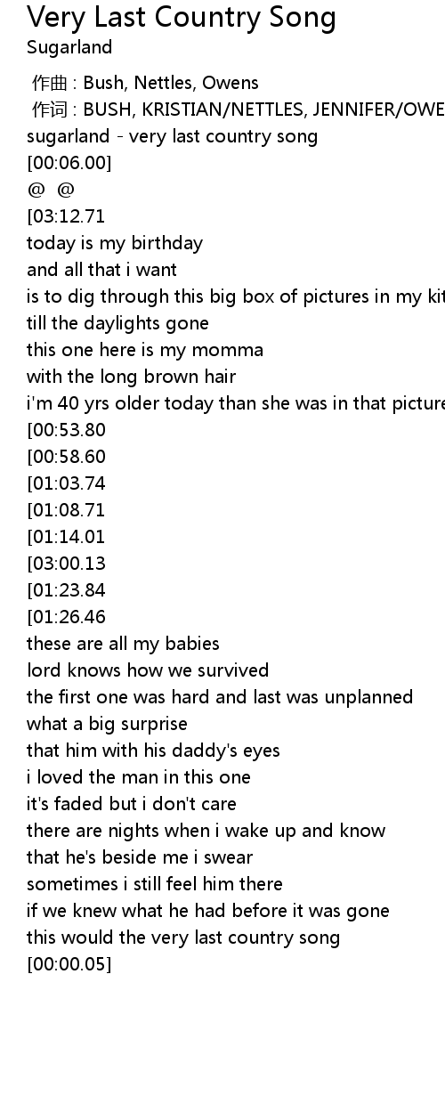 | [00:00.01] | 作词 : BUSH, KRISTIAN/NETTLES, JENNIFER/OWENS, TIM |