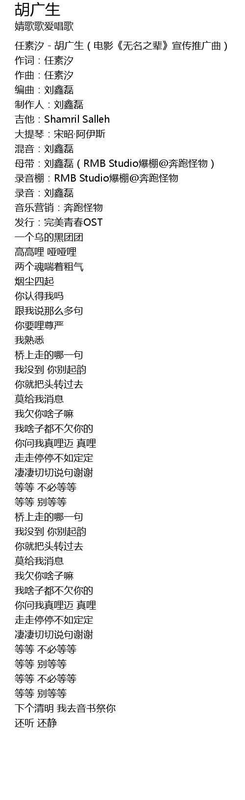 | [00:04.176] | 任素汐 - 胡广生(电影《无名之辈》宣传推广曲) |