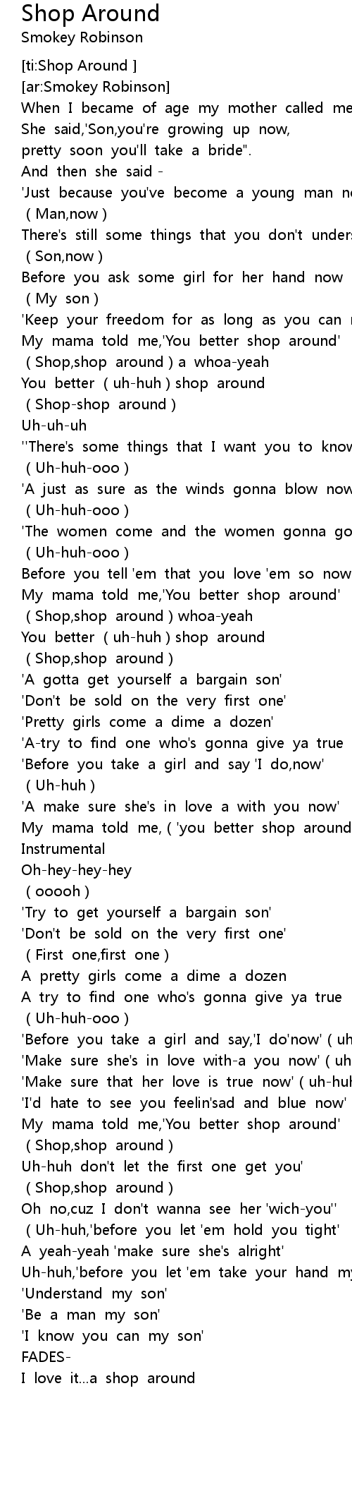 | [00:53.274] | My mama told me,' You better shop around' |