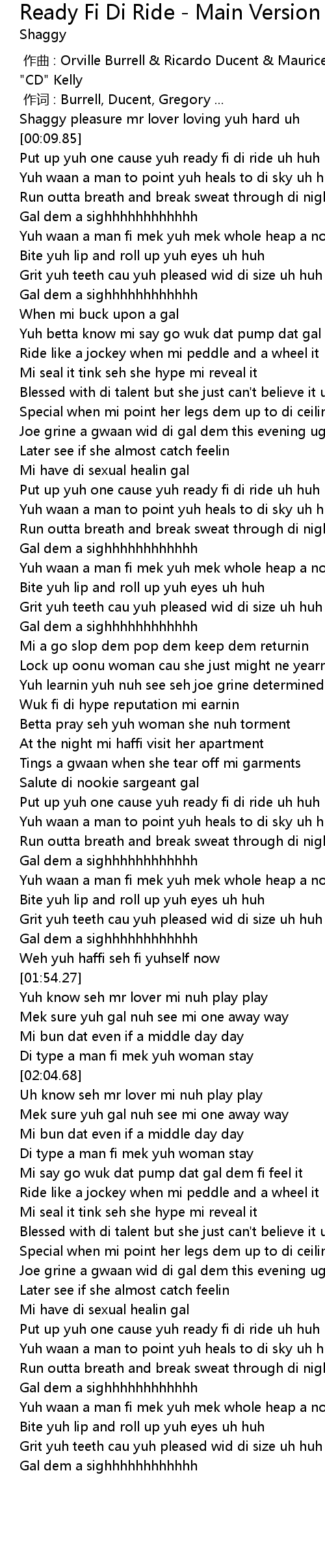 | [00:10.36] | Put up yuh one cause yuh ready fi di ride uh huh |