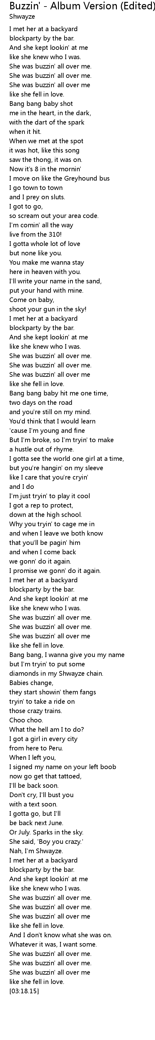 | [00:17.81] | She was buzzin' all over me |