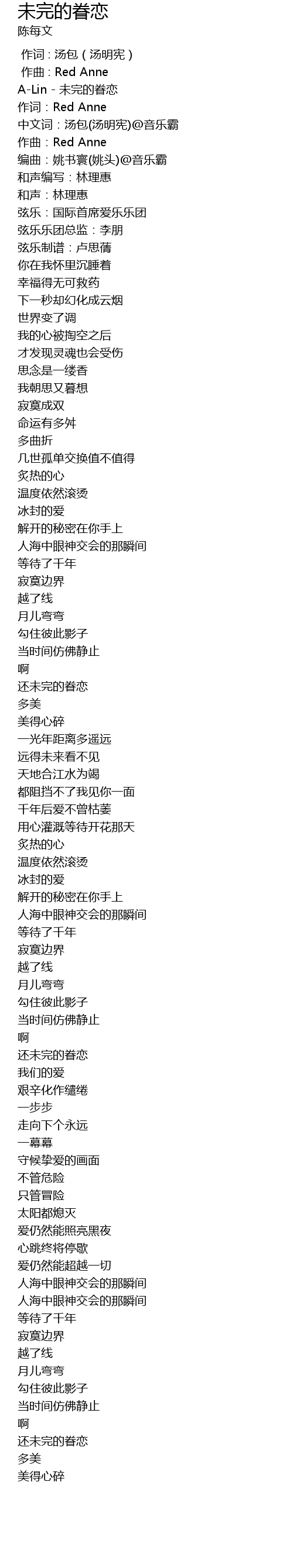 | [03:51.68] | hái wèi wán de juàn liàn |