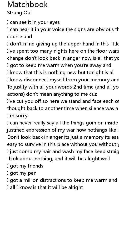 I've spent too many nights here on the floor waiting for something inside you to change don't look back in anger now is all that you can say cuz angers all |