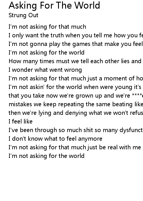 I'm not askin' for the world when were young it's only fun it's just the chances that you take now we're grown up and we're ****ed up and we make the same mistakes we keep repeating the same beating like it's not a choice to make and then we're lying and denying what we won't refuse to change |