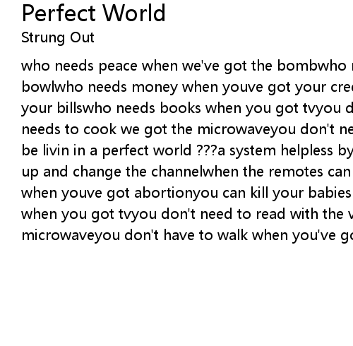 who needs peace when we've got the bombwho needs to love when you got the bowlwho needs money when youve got your credityou got your plastic paying all your billswho needs books when you got tvyou don't need to read with the vcrwho needs to cook we got the microwaveyou don't need to walk when you've got a carwe be livin in a perfect world ???a system helpless by itself ???who needs to get up and change the channelwhen the remotes can do that for youwho needs children when youve got abortionyou can kill your babies if you want towho needs books when you got tvyou don't need to read with the vcrwho needs to cook we got the microwaveyou don't have to walk when you've got a car[chorus] |