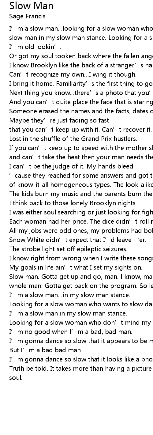 | I' m a slow man looking for a slow woman who wants to slow dance. I' m a slow man in my slow man stance. Looking for a slow woman who don' t care that I' m old lookin'. | |
