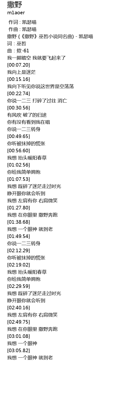 | [00:00.00] | 撒野 (《撒野》巫哲小说同名曲) - 凯瑟喵 |