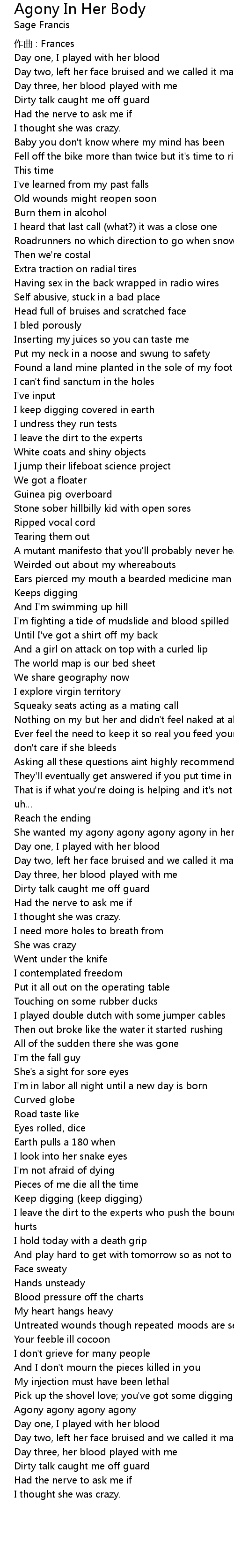 | Ever feel the need to keep it so real you feed yourself into her hunger and don' t care if she bleeds | |