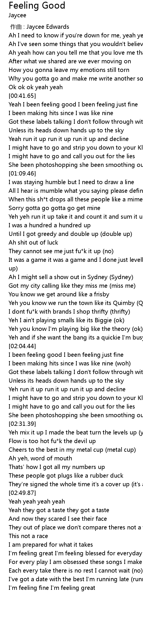| [00:41.66] | Yeah I been feeling good I been feeling just fine |