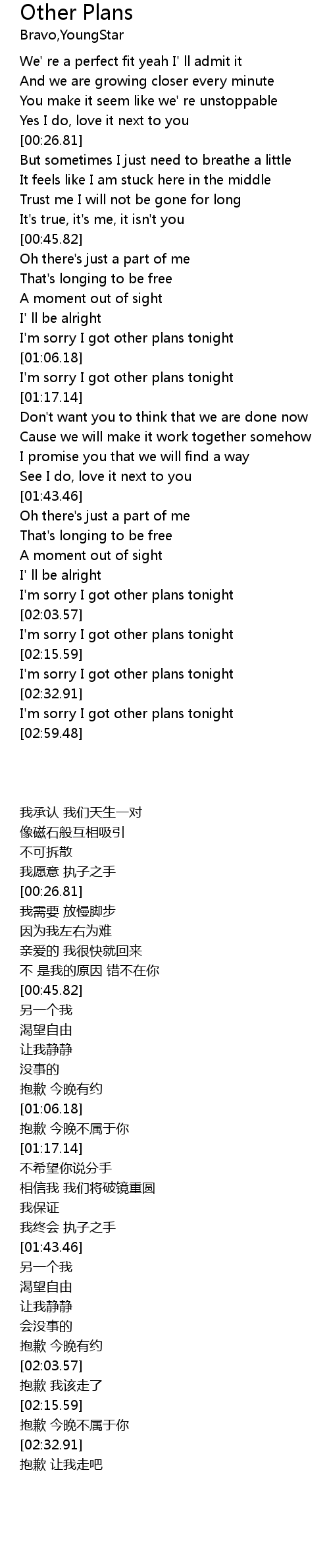 | [02:56.90] | I'm sorry I got other plans tonight |