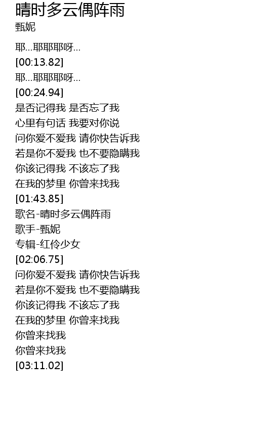 | [01:48.94] | 歌名-晴时多云偶阵雨 |