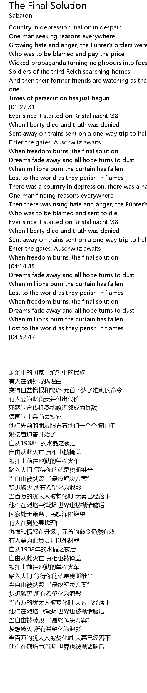 | [00:40.85] | Growing hate and anger, the Fü hrer' s orders were precise |