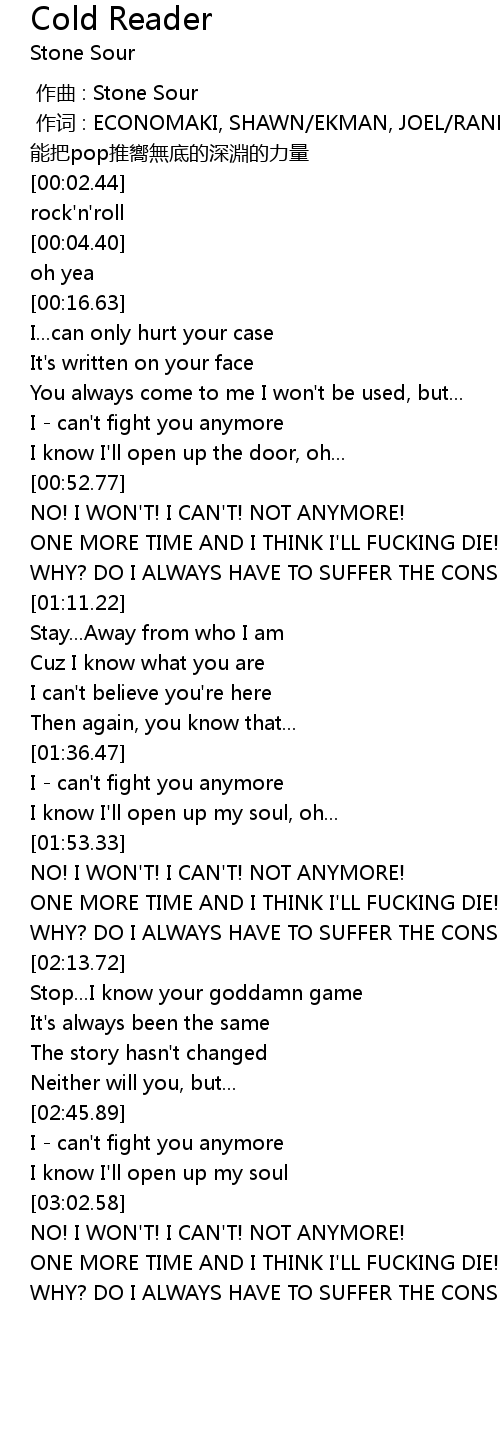 | [00:00.00] | zuò qǔ : Stone Sour |
