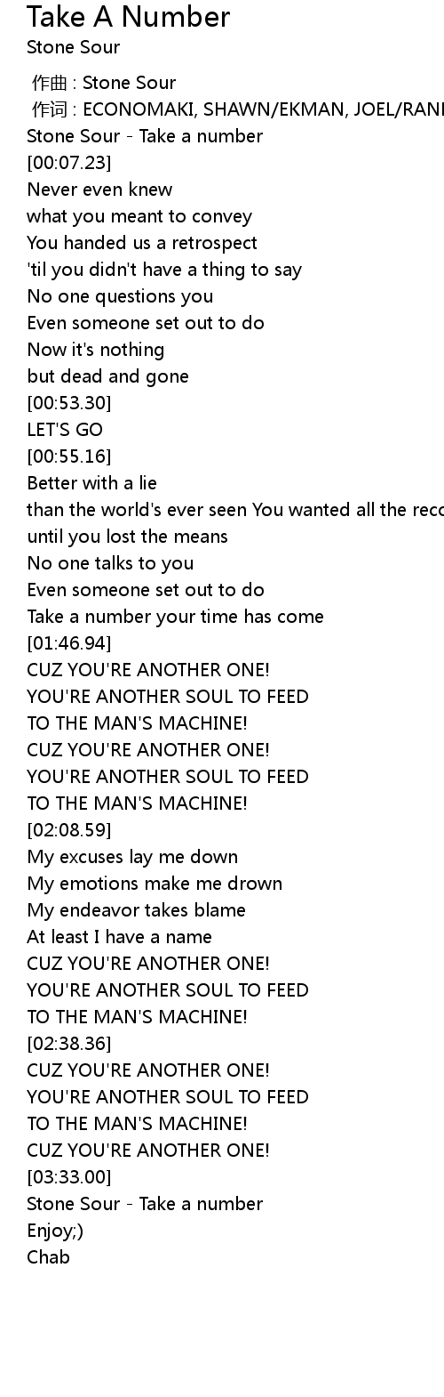 | [00:00.00] | Stone Sour - Take a number |