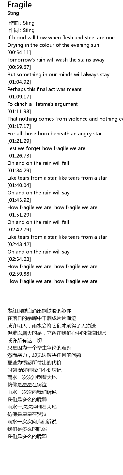 | [02:55.61] | How fragile we are, how fragile we are |