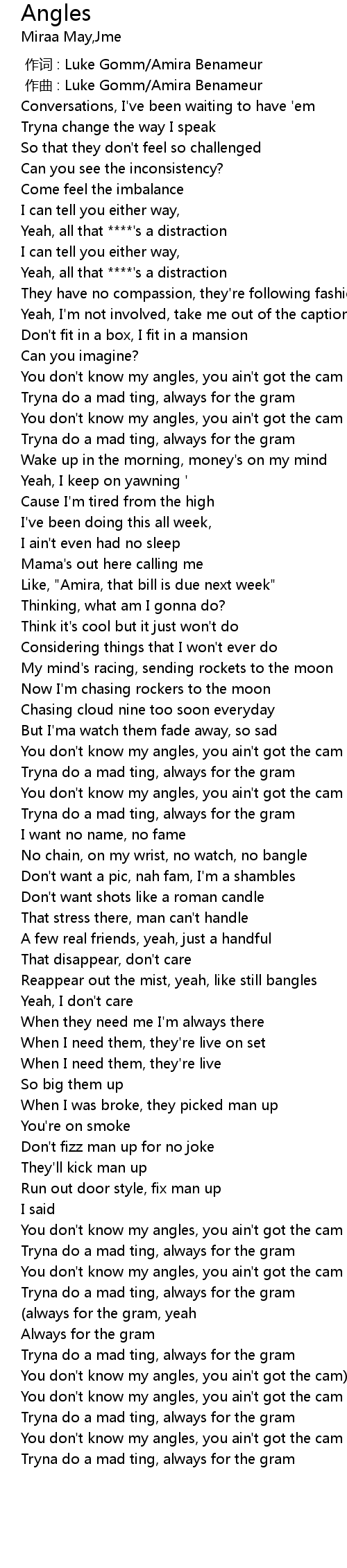 | [00:46.73] | You don't know my angles, you ain't got the cam |