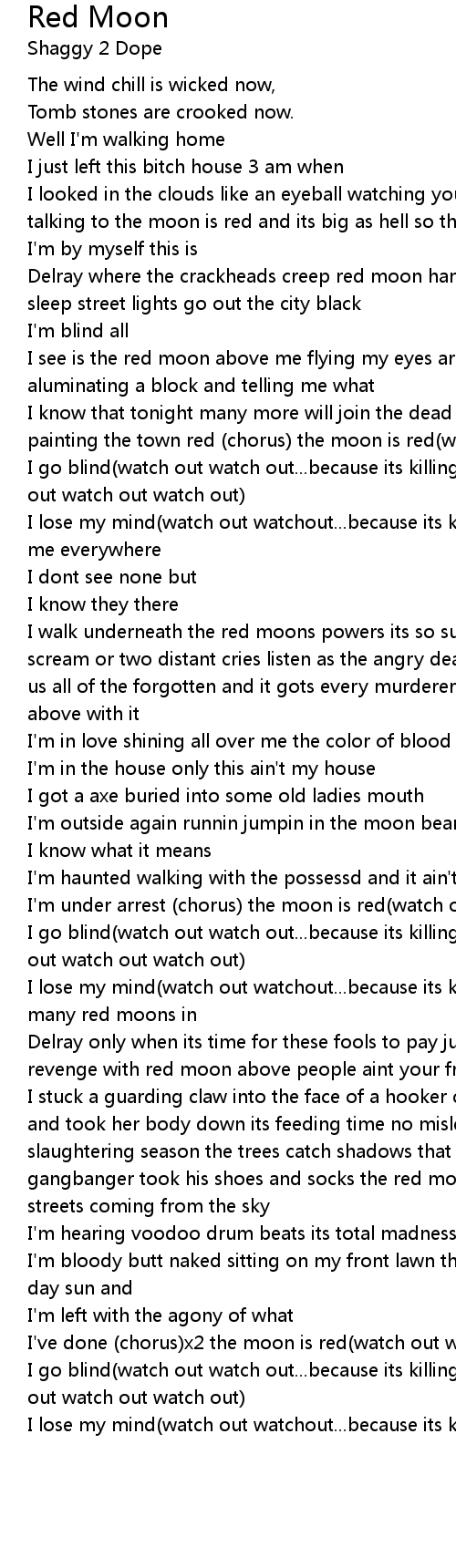 I know that tonight many more will join the dead its just me and the moon baby painting the town red (chorus) the moon is red(watch out watch out watch out)