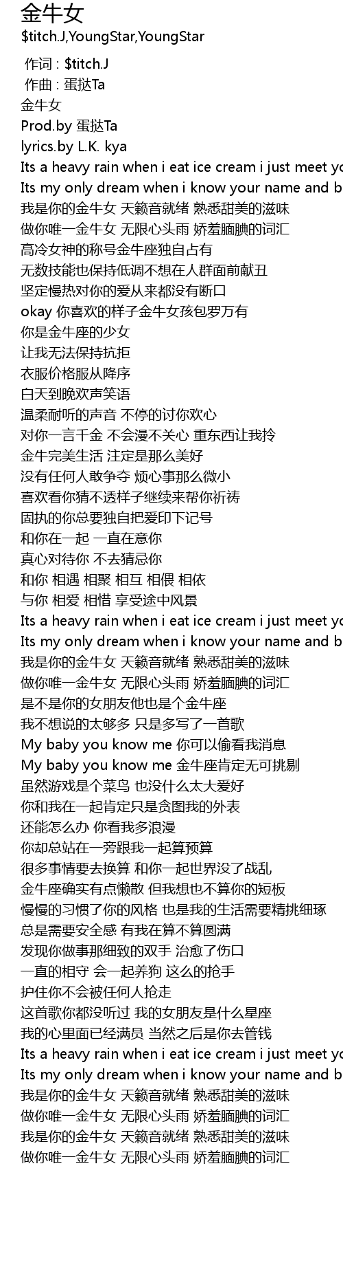 | [01:57.404] | 做你唯一金牛女 无限心头雨 娇羞腼腆的词汇 |