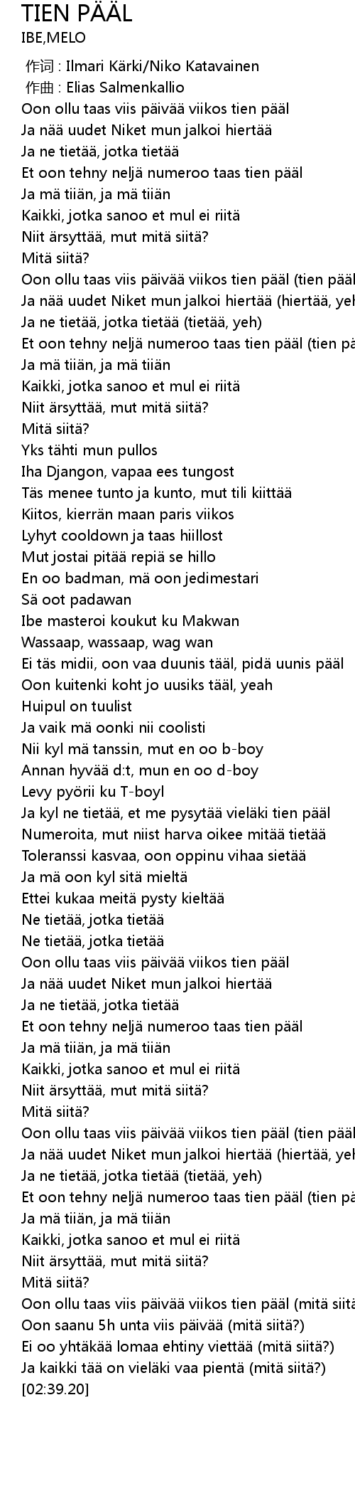 | [01:16.40] | Annan hyvää d:t, mun en oo d-boy |