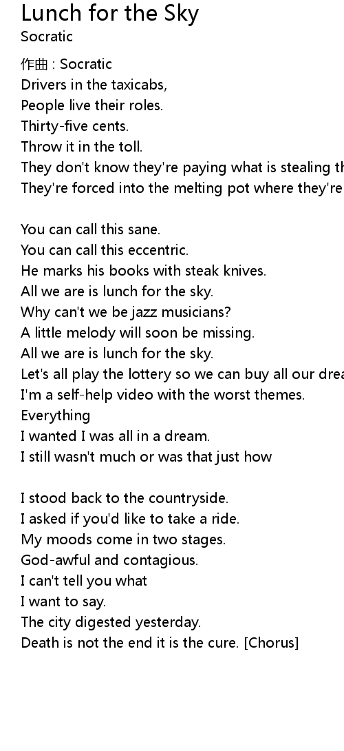 | Song | Lunch for the Sky |