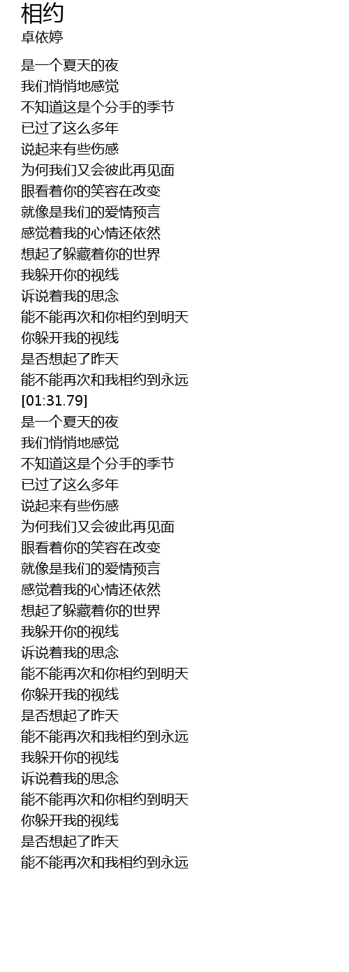 | [01:14.74] | néng bù néng zài cì hé nǐ xiāng yuē dào míng tiān |