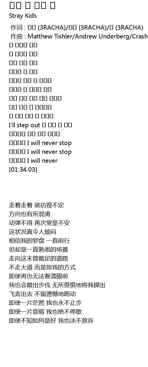 | [00:00.000] | 作词 : 방찬 (3RACHA)/창빈 (3RACHA)/한 (3RACHA) |