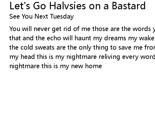 | You will never get rid of me those are the words you said I'll go to sleep with that and the echo will haunt my dreams my wake up shivers which are a result of the cold sweats are the only thing to save me from all the horrors that lie in my head this is my nightmare reliving every word you said welcome to my nightmare this is my new home |
