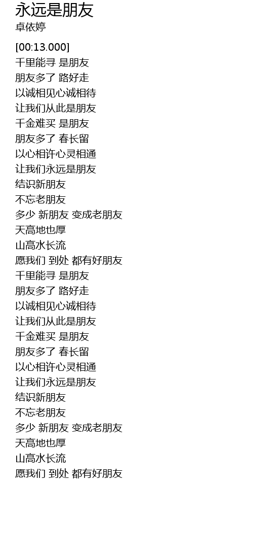 | [03:14.390] | 愿我们 到处 都有好朋友 |