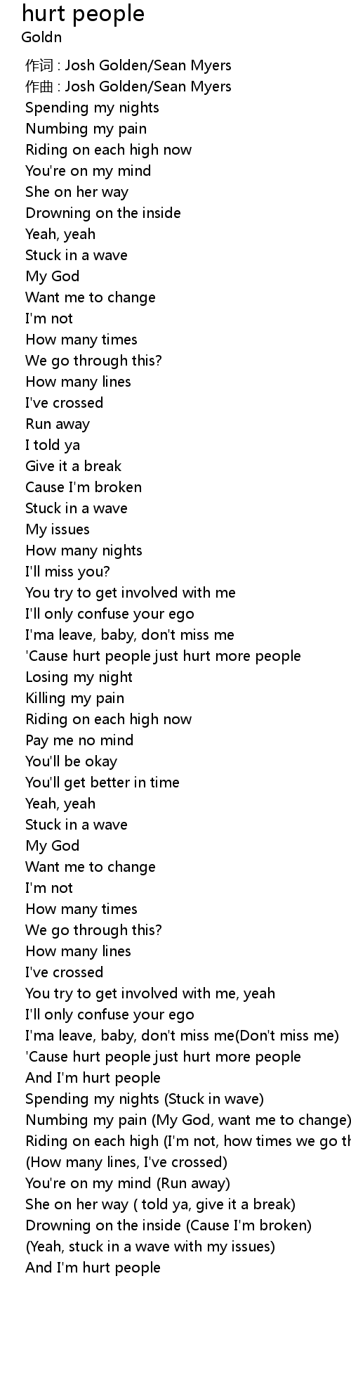 | [01:10.632] | ' Cause hurt people just hurt more people |