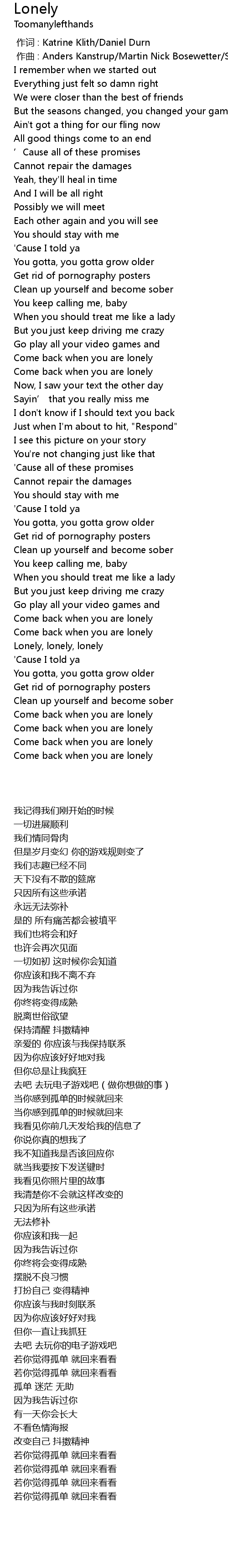 | [02:19.68] | Lonely, lonely, lonely |