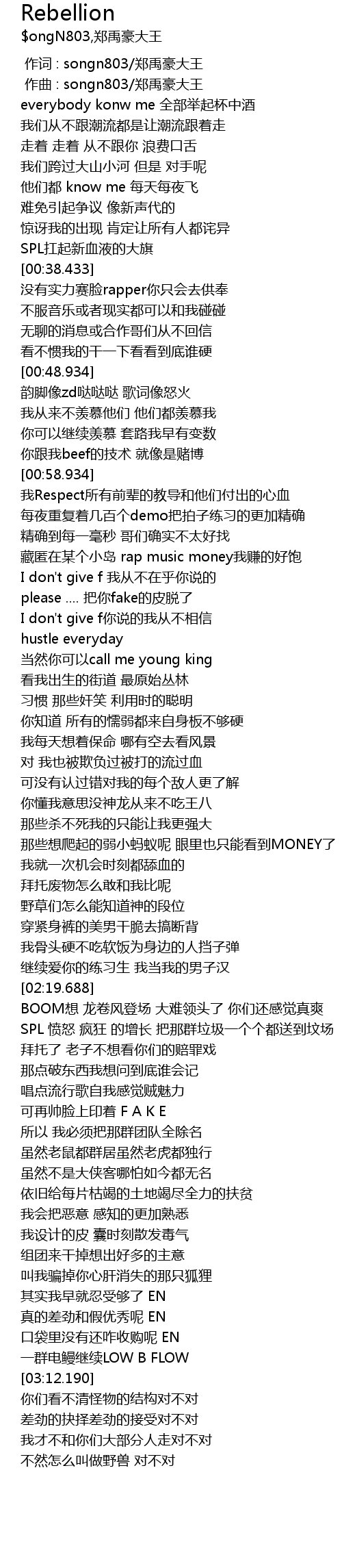 | [00:50.434] | 韵脚像zd哒哒哒 歌词像怒火 |