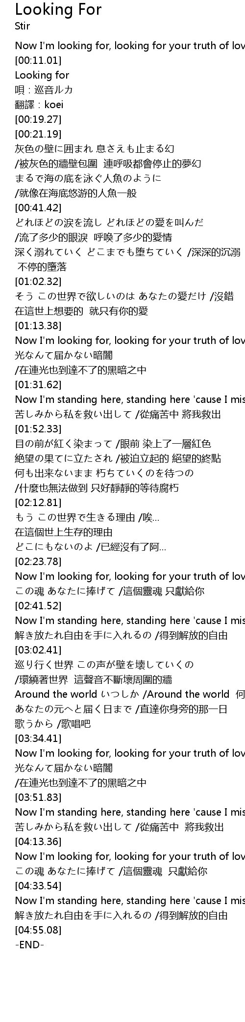 | [04:16.55] | Now I' m looking for, looking for your truth of love |