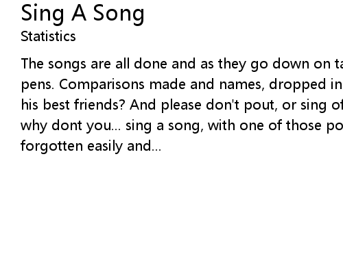 | The songs are all done and as they go down on tape, the critics click their pens. Comparisons made and names, dropped in all bold face, does he sound like his best friends? And please don't pout, or sing of love, it's all been done, why dont you... sing a song, with one of those pop melodies, that arent forgotten easily and... |