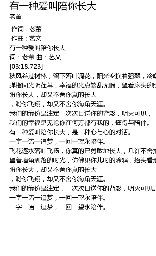 | [03:33.224] | 我们的缘份是注定,一次次目送你的背影,明灭可见。我们的幸福是无论你在何方都有我的,懂得与陪伴。有一种爱叫陪你长大,是一种心与心的对话。 |