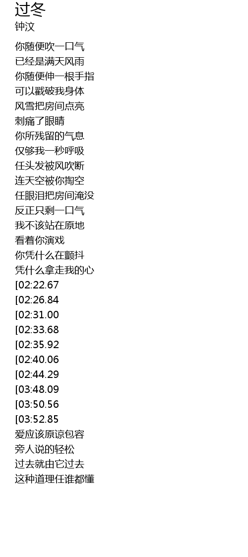 | [04:04.47][03:52.85][02:53.01][01:26.30] | 就由我冰封过冬 |