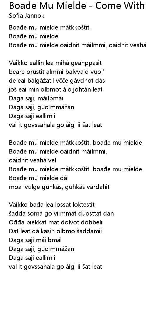 | Boađe mu mielde mátkkoštit, boađe mu mielde | |