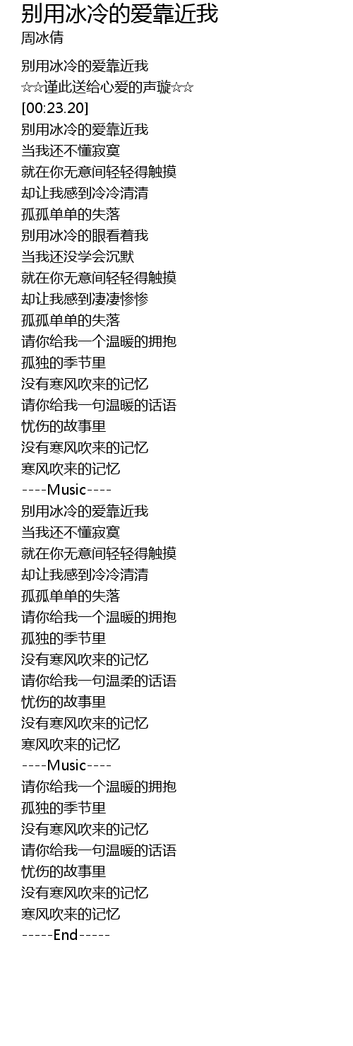 | [01:58.27] | 别用冰冷的爱靠近我 |