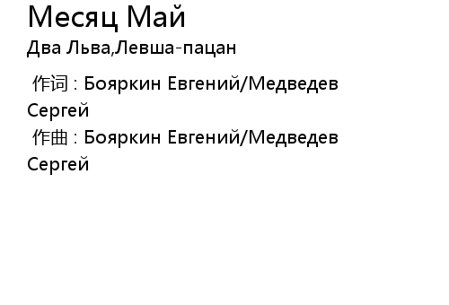 | [00:00.00-1] | 作词 : Бояркин Евгений/Медведев Сергей |