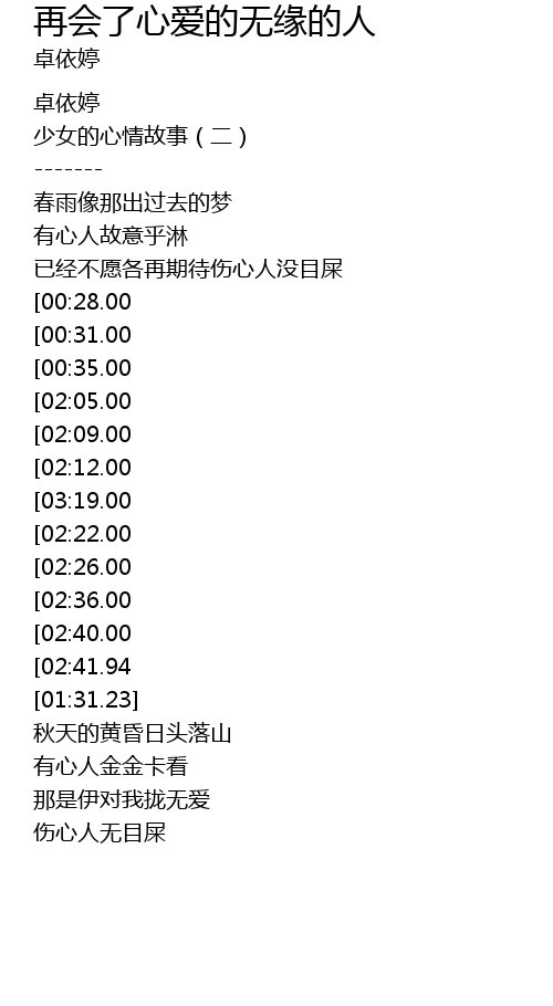 | [03:06.88][03:19.00][02:33.00][02:19.00][01:09.00][00:55.80] | 再会啦心爱的无缘的人 |