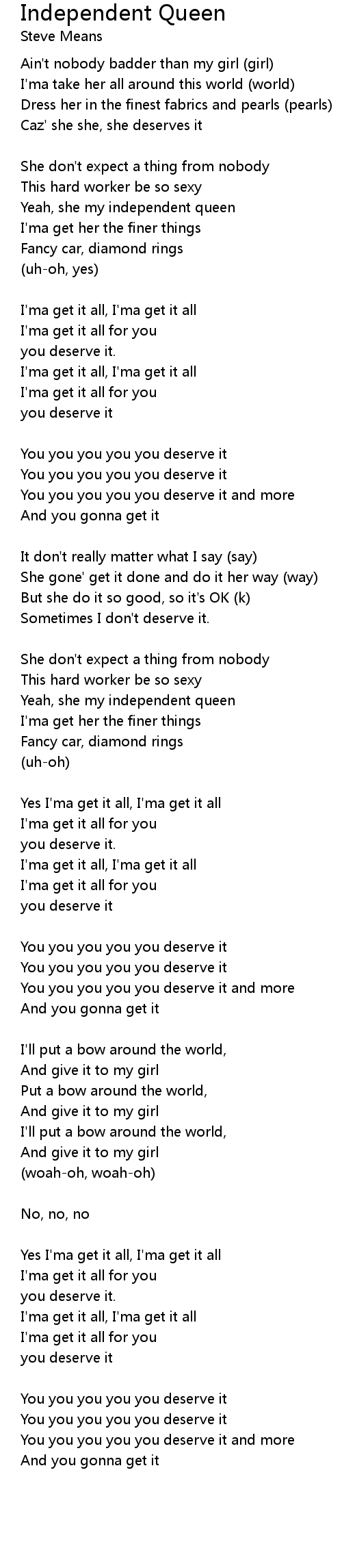 Yeah, she my independent queen |