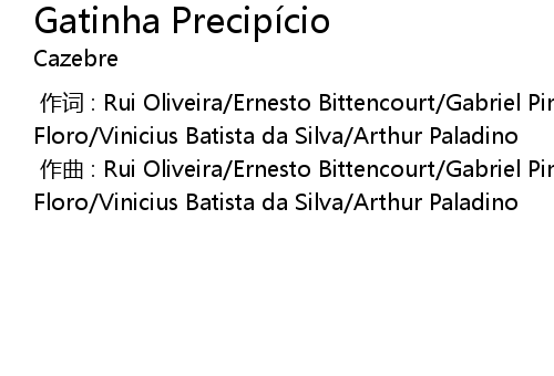 | [00:00.00-1] | zuo qu : Rui Oliveira Ernesto Bittencourt Gabriel Pinheiro Floro Vinicius Batista da Silva Arthur Paladino |