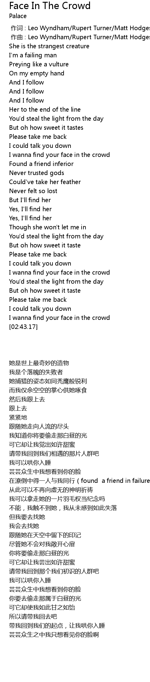 | [02:39.27] | I wanna find your face in the crowd |