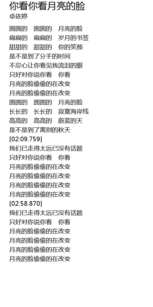 | [02:45.490] | 月亮的脸偷偷的在改变 |