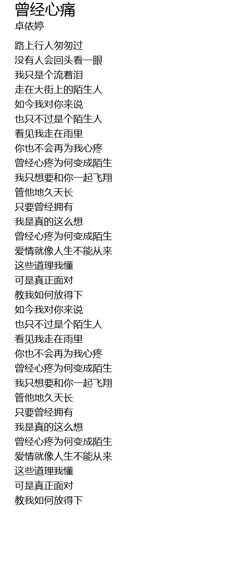 | [01:22.520] | 曾经心疼为何变成陌生 |