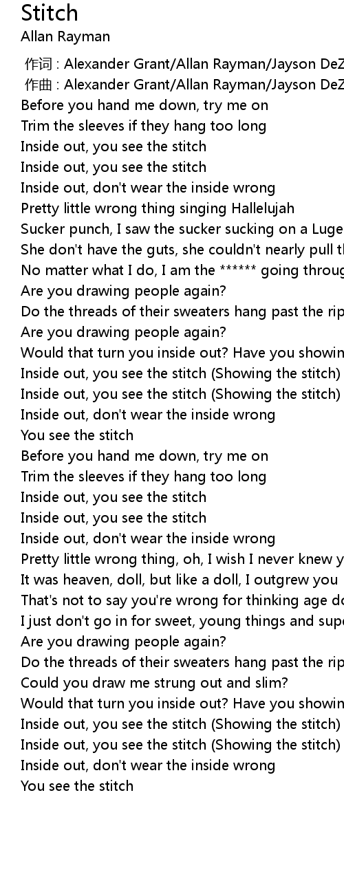 | [02:31.74] | Inside out, you see the stitch Showing the stitch |