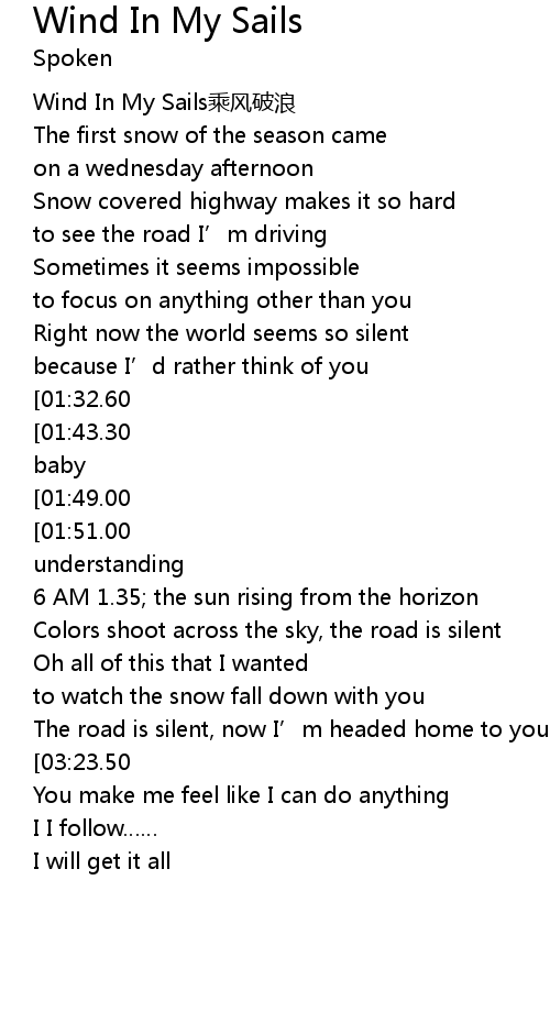 | [00:57.30][01:43.30][01:54.50][03:07.60][03:19.00] | You are the wind in my sail, baby |