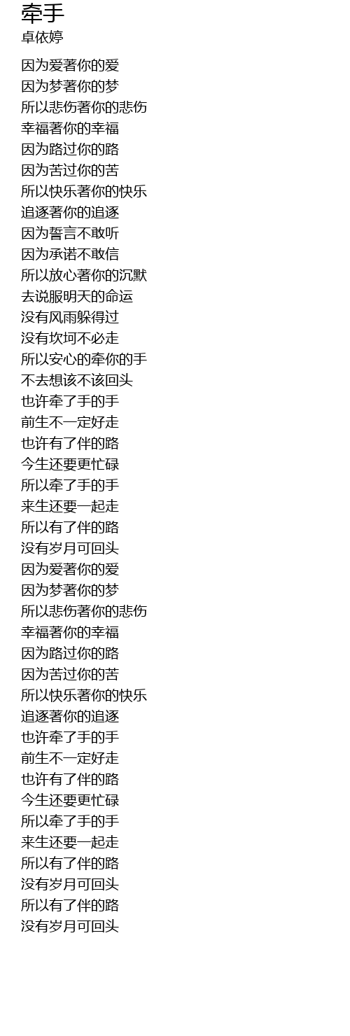 | [01:43.000] | suǒ yǐ ān xīn de qiān nǐ de shǒu |